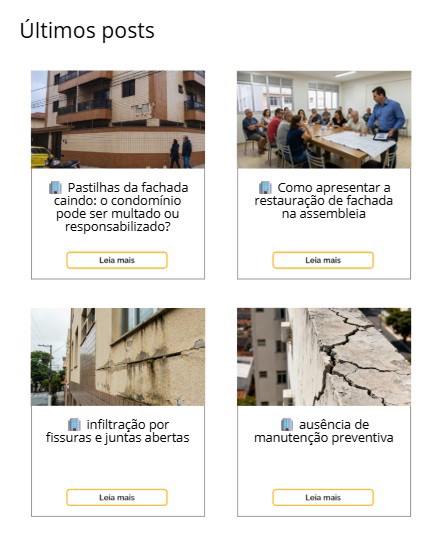 Artigos técnicos sobre infiltrações, trincas, destacamento de revestimentos, inspeções prediais e manutenção preventiva de fachadas conforme normas técnicas.