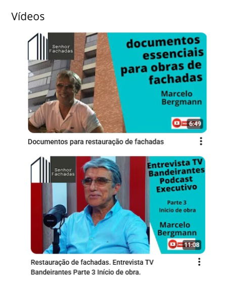 Vídeos explicativos mostrando diagnósticos reais, soluções construtivas e execução de obras em fachadas para auxiliar síndicos na aprovação de serviços.