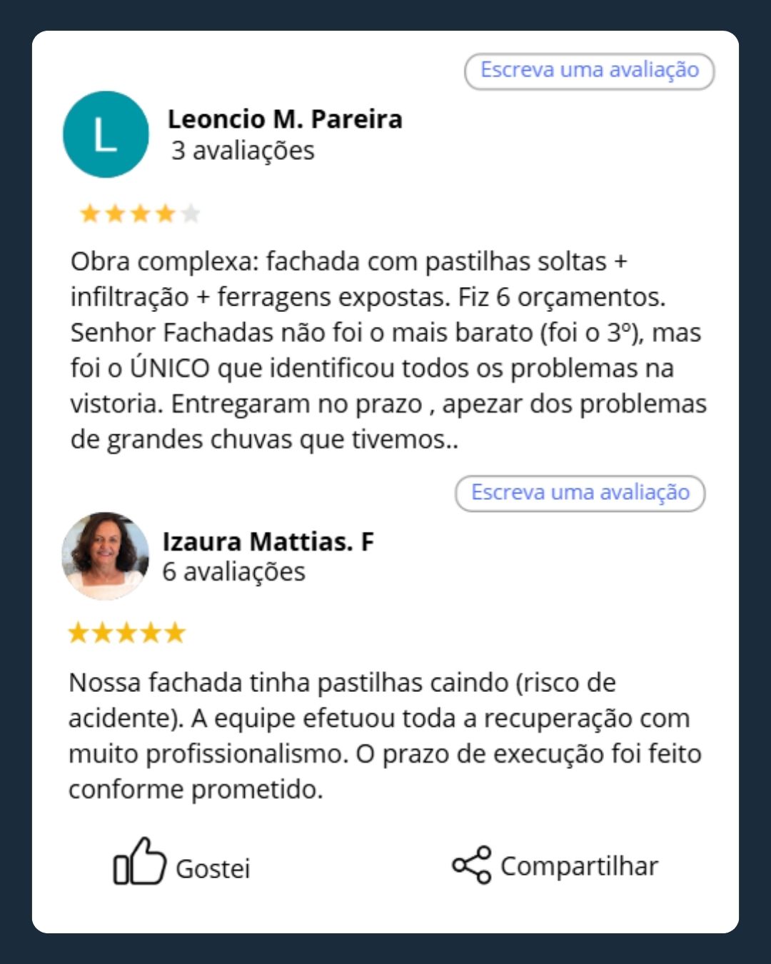 Especialistas em restauração de fachadas prediais, com foco na recuperação de fachadas com pastilhas. Realizamos o diagnóstico completo para recuperação estrutural de fachadas, garantindo a reposição fiel e a segurança do revestimento. Ideal para: Prédios com pastilhas caindo ou desplacamento.